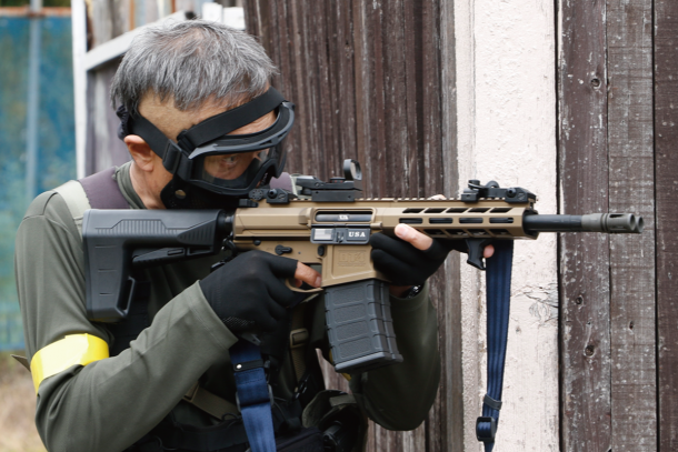 マルゼンのエアコッキングショットガンCA870は高い命中精度とコッキングのしやすさで愛用者が多い。この参加者はドットサイトとサイレンサーで戦闘力を高めている