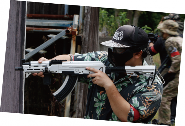 東京マルイの次世代電動ガンAKホワイトストームにアロハシャツがベストマッチ。目立ちそうに見えてロービジ効果が高い