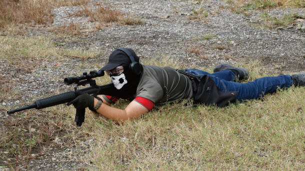 M16A2をベースにフロントサイトをオミットしてスコープを装着したしたスポーターカスタムをプローンで構える参加者。確実に敵をヒットしていた