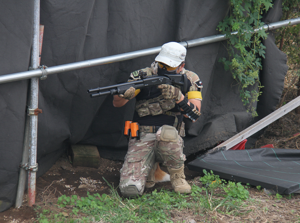 エアコッキング式のショットガンで応戦する参加者。確実なポンプアクションをできるようにフォアエンド部分にスティップリングが施されていた