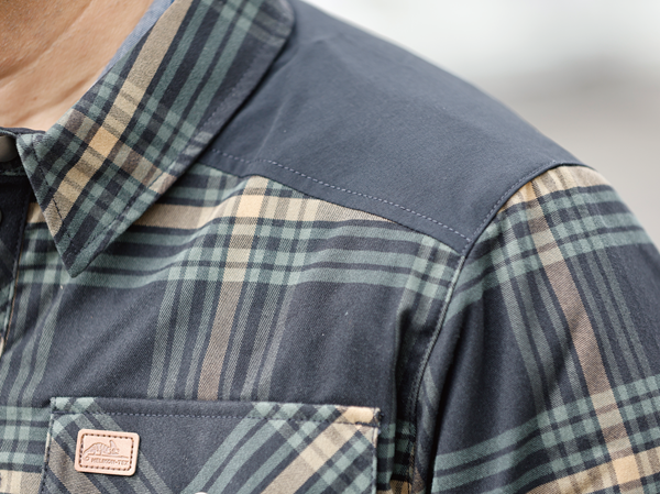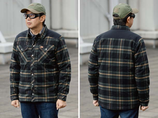 生地にチェック柄の速乾性合成繊維を使用し、軽量な60g/m2の中綿キルティングを裏地に施したシャツジャケット。内側の2つの大容量ポケットをはじめ合計7つのポケットが設けられている。フロントにはスナップボタンを使用され素早く開閉できる。