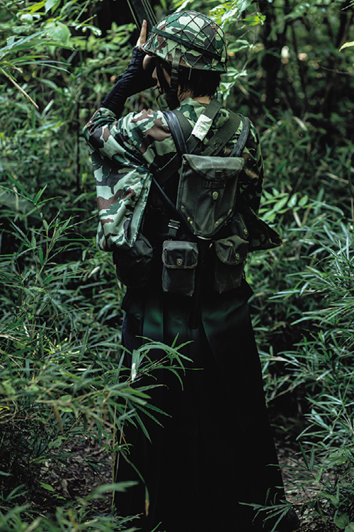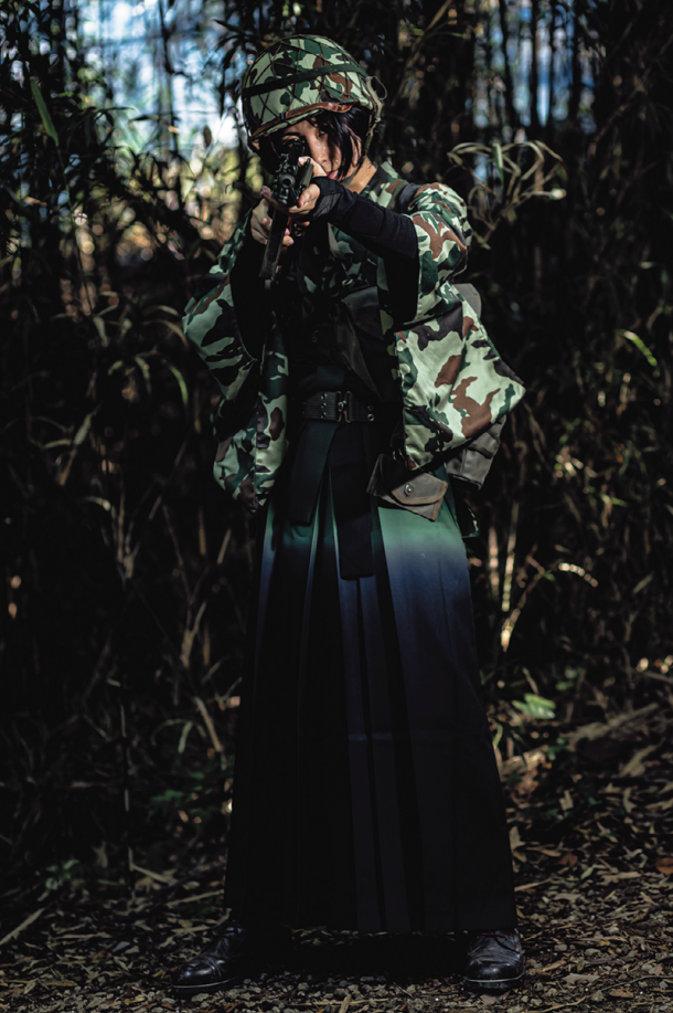 数ある和装ミリタリースタイリングの中から、今回は陸上自衛隊の新旧2種類の装備と和装袴装備を組み合わせている。腰回りの装備は、弾帯ベルトを使用しているが、それが帯の代わりになり、帯の上に重ねて装備可能だという。