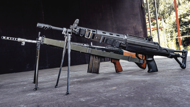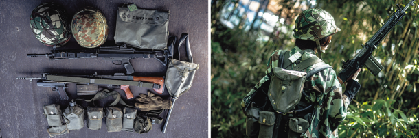 東京マルイ製89式小銃(写真手前)は、陸上自衛隊第一空挺団へのリスペクトで折曲銃床式を使用している。負い紐は、ちょんまげインプ製品の3点スリングを装着。このスリングは、実物に似せることにこだわるメーカーの代表製品として、多くの自衛隊スタイルユーザーに愛用されている。