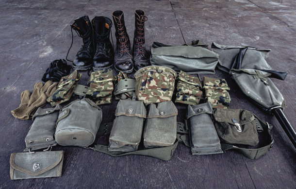 旧装備のベルトキットには、旧式の弾帯(ピストルベルト)にサスペンダーを組み合わせて、弾帯に弾納(ライフルマガジンポーチ)、水筒覆いに覆われた水筒などを装着している。防護マスクケース2型と旧型の救急品袋が装備のポイントとなっている。