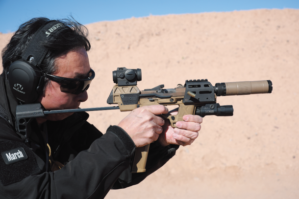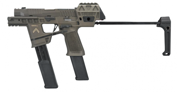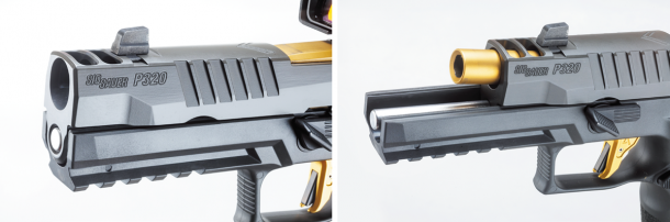 P320のフルサイズXシリーズをベースに、2ポートコンペンセイター付きスライドと3.9インチバレル、アンビのデュアルマガジンリリースシステムを内蔵したモデル。ストックが付いているように見えるが、これは引き出し式のスタビライジングブレイスでストックではない。後部にはスライド作動とは連動しないピカティニーオプティックマウントを持つ。全長277mm、重量1,395g、30連マガジンが2本付属する