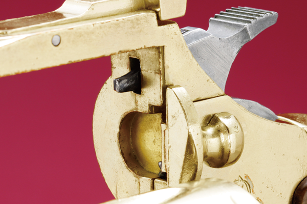 原型製作を担当したのは六研の六人部登(むとべのぼる)さん。MGCと同等の価格帯を実現するため、板ばねをすべて線ばねに変え、小林さん同様リバウンド機構とセーフティ機構を大胆にカット。こうするとハンマーノーズがフレーム側に出たままになってしまうので、六人部さんはハーフコックを取り入れることにした。これならスムーズにシリンダーの出し入れができる。