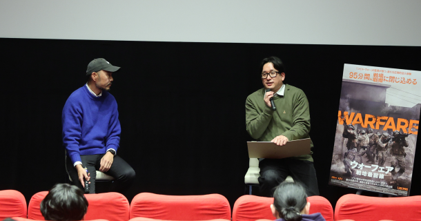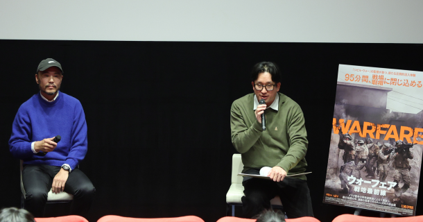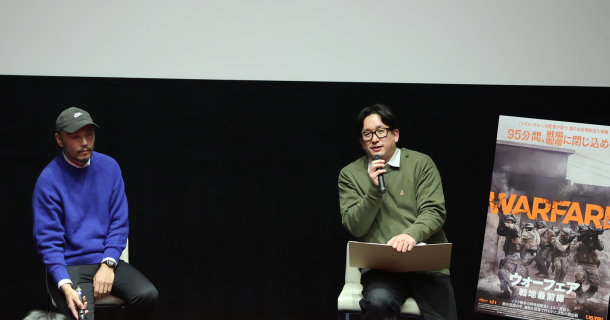 まるで戦場に放り込まれたかのような、臨場感あふれる本作の特⻑、演出などはもちろんのこと、徹底的なリアリズムを追求した本作に登場する銃器や、装備などを感じてもらった。また、上映後には本誌ライターのGhost in the Dark:土居氏と元⾃衛官で装備専⾨店geartlesの オーナー槇原清賢氏とのトークショーが行われ、銃器、装備に関しての専門的な話を聞くことが出来た。