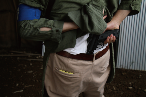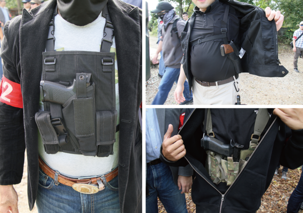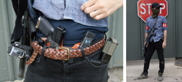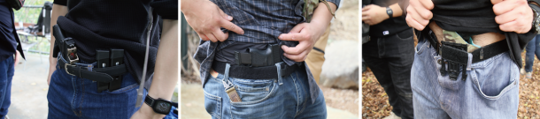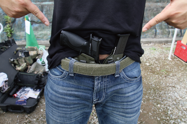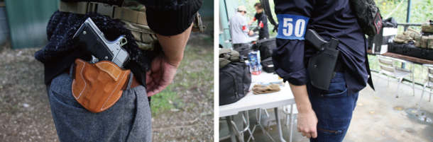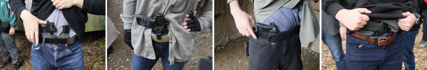 ホルスターを使わずに直接パンツに差して携帯する、いわゆるメキシカンキャリーの参加者もいた。一般的な銃なら種類を問わず使用可能で、銃を隠せば民間人に偽装できる携帯方法である