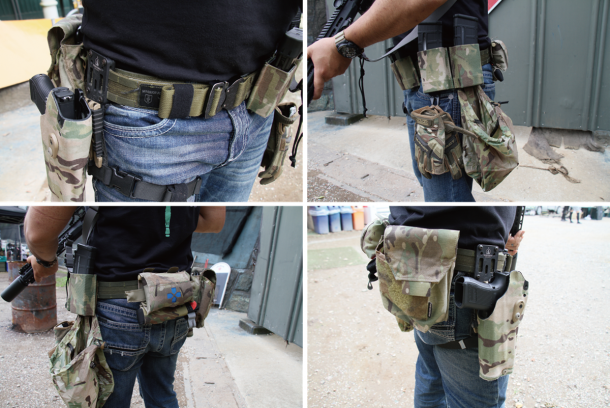 オープンキャリー用のベルトキット。Warrior Poet SocietyのモールベルトにEsstacのピストルとライフルマガジンポーチ、Flatline Fiberのダンプポーチ、ブルーフォースギアのメディカルキットポーチ、スピリタスシステムズのユーティリティポーチ、サファリランドのホルスターを装着。必要最低限をすべて収めた見本となるセットアップだ