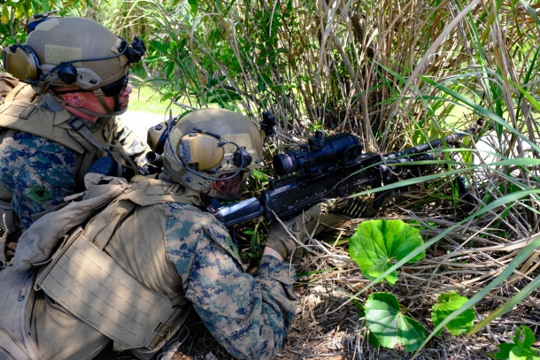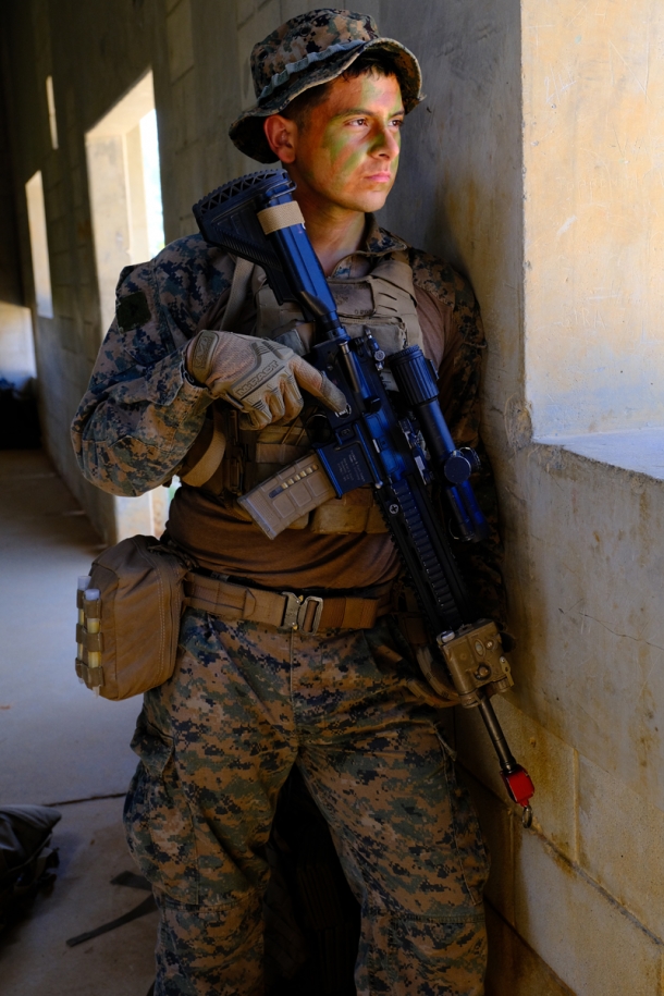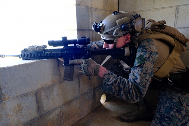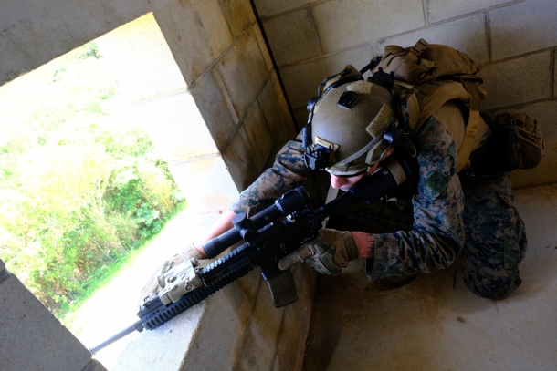建物の2階の窓から、M27 IARを構えて射界を確認する海兵隊員。レシーバー上にはTrijicon VCOGを搭載している。戦闘時には窓から離れて射撃することになるだろうが、建物を制圧していく攻撃側にとって、こうしたスナイパーの存在は脅威となるはずだ