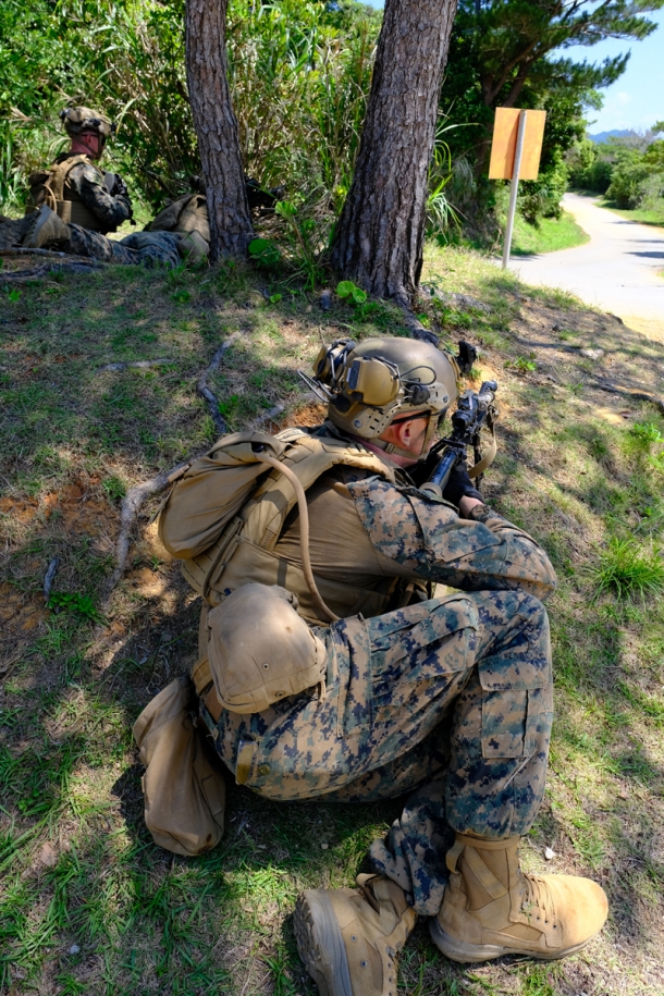 対抗部隊は屋外にも兵を展開。写真の海兵隊員は道路の交差点を警戒している