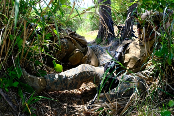 植生や地形を活かして待ち伏せする。なお、対抗部隊の隊員は、ほとんどがFirstSpear製のプレートキャリア、Gen3タイプを着用していた