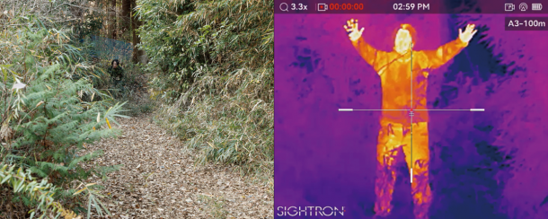 そもそも、サーマルビジョンは、可視光ではなく物体が持つ熱が発する遠赤外線を検出して画像を生成し、暗闇や霧中でも使用できるのはもちろん昼間においても動物や人物、熱源を素早く発見できる。単体ではモノキュラーとして、専用マウントベースを併用すれば20mm規格のレールにマウントできる。SIGHTRON JAPANはアフターサポートも充実しているため購入後も安心だ。