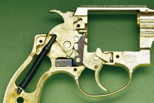設計を手がけた小林太三(こばやしたぞう)さんは、リアルサイズで、実銃のメカニズムをベースに設計することにした。マルゴーのデテクティブ同様、モデルガンではなくても差し支えない安全機構のハンマーブロックは省略したものの、ハンマーのリバウンド機構は再現した。こうしないと火薬を詰めたカートリッジがハンマー(ノーズ)に当たって、スウィングアウトしたシリンダーを戻しにくいからだ。ただ精密で複雑な動きをするS&Wのダブルアクションは、シンプルなダブルアクションにアレンジした。そしてニュー・チーフスペシャルは1969年に発売された。