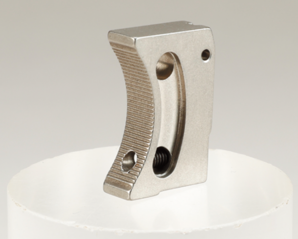 SUS材の削り出しで製作されたメタル感の強いカスタムトリガー。前面の滑り止め加工に「細目」と「粗目」の2タイプをラインアップ。