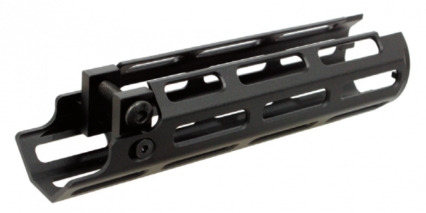 MP5のハンドガードと交換して装着するアルミ合金製M-LOKハンドガード。8角形断面で上面を除く7面にM-LOKスロットを配置、MP5のモダナイズには欠かせない。