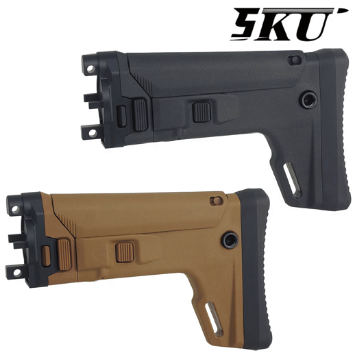 MP5Kに直接装着する樹脂製ストック。伸縮機能、フォールディング、チークライザーはすべて可動。QDスイベルポイントは左右選択式のものが装備されている。