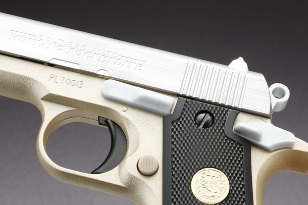 実銃のコルトマスタングはガバメントシリーズの最小モデルで口径は.380ACP。ガバメントをそのまま小さくしたかのような外観が特徴だ。クラウンモデルはこのコンパクトなボディにエアコッキングメカを凝縮。ローパワーながら安定した弾道が得られる。ハンマーはフレーム側に固定されている。サムセーフティは可動するもののダミーで、スライドストップがマニュアルセーフティの役割を果たしている。