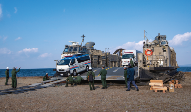 まずは愛知県田原市にある白谷海浜公園にて行われた海自LCACによる車両輸送訓練だ。東日本大震災、能登半島地震など、これまで日本を襲ったいくつもの災害に対し、人員や資機材、車両を迅速に輸送してきたLCAC。本訓練でも欠かせない装備となった。