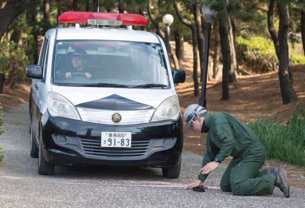 ただし、LCACは当然ながら軍用として開発された装備であるため、戦車や装甲車などの軍用車両の運用のみが考えられている。よって、民間フェリーなどと違い、一般車両の乗り降りは考慮されていない。そのため、このLCACから降りる際の段差は、一般車両の車高では厳しい。今回のように、そうした車両を取り扱う際は、車体を傷つけず、タイヤをパンクさせないための配慮がどうしても必要となる。さらに降りた先に広がる砂浜も、四輪駆動車でない限り、足を取られスタックする可能性もある。そこで、今回は、LCACの前部ハッチ上にスロープを作り段差をなくし、金属板やプラスティック製の板を砂浜に敷いて、足場を固めた。こうした検証も今回の訓練の目的の一つだ。これら車両を降ろした後は、愛知県警のパトカーを搭載する流れとなっており、海自隊員が、事前に車体や車高の長さを図るなど、車体全体を念入りに確認している姿も見られた。
