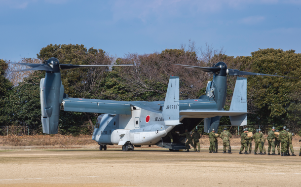 同じ田原市にある渥美運動公園では、第1ヘリコプタ―団・輸送航空隊のV-22が救援物資輸送を行った。固定翼輸送機のようなスピード、そしてヘリのように離着陸場所を選ばないのがこの機体の特徴だ。公園や駐車場など、一定の広さがあれば、こうして任務遂行できる。物資を受け取りに来た自衛官の中には即応予備自衛官も含まれていた。東日本大震災でも召集がかけられ、このように被災地で活動した実績もある。V-22の後部ハッチが開かれ、そこから段ボールをリレー方式で車両へと搭載していった。