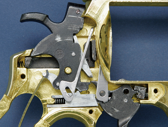1970年代くらいまでの金属モデルガンの多くは、上から見るとバレルと一体のフレームが反っているものが多い。金型から出した後、冷える過程で形状や厚みの違いなどによって温度差ができ、早く冷えたところにゆっくり冷える部分が引っ張られるからだ。そのため、高い精度が必要とされる実銃のダブルアクション機構をそのまま再現するのは非常に困難で、ラフな精度でも作動するメカニズムが考案され、採用されていった。S&Wのダブルアクションメカは、MGCが1969年に発売したニュー・チーフスペシャルで採用されていたメカがモデルガンにはピッタリだったことから、他社でも採用されスタンダードとなっていた。