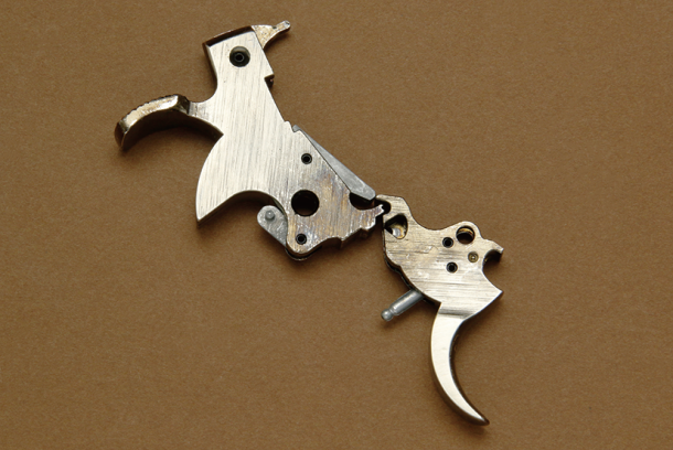 おそらく金型から出した後の変形を防ぐためのいろいろな施策が行なわれていたのだろうが、その1つが分解しやすくするためという取り外し可能なトリガーピンだったのではないか。フレームが完全に冷えて変形や歪みが生じなくなってから穴を開けてピンを立てれば、確実にフレームに対して90度で取り付けることができる。ハンマーとの位置もかなり正確に決められ、しかもピンは同一の太さなのでよりスムーズにトリガーが回転できる。1970年代の頂点に立つモデルガンだった。