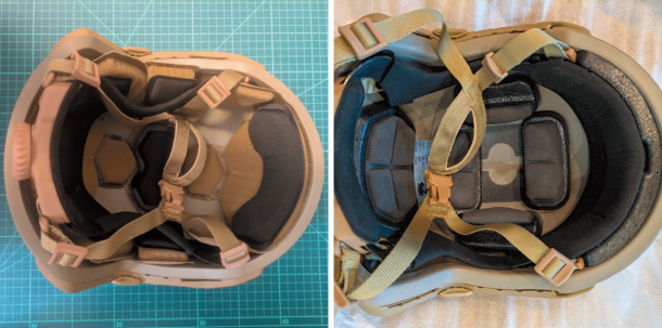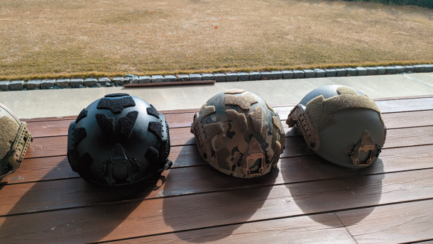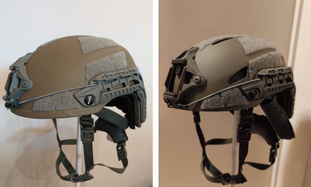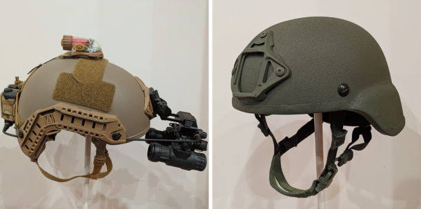 写真右の防弾ヘルメットは、アラミド製である。UHMW-PEよりも高価で厚さが約10mm程度である。製品にもよるが、近くで見ると繊維感があることが多い。UHMW-PE×アラミド等を組み合わせた複合材は、アメリカの防弾ヘルメットメーカーであるOPS-COREなどの高級価格帯の製品に使用される最も薄く超軽量な素材である。