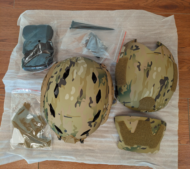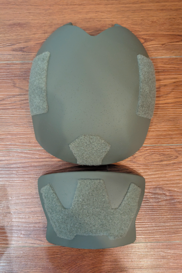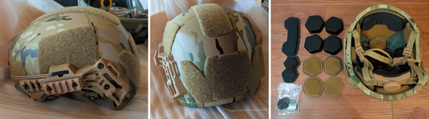 右側にある甲羅形状のマルチカムカラーのアプリケ装甲セットは、LPBA(LOW PROFILE BALLISTIC APPLIQUE)といい、バンプヘルメットを防弾ヘルメットにするアイテムである。装甲はLevel 3AでUHMW-PE製になっている。