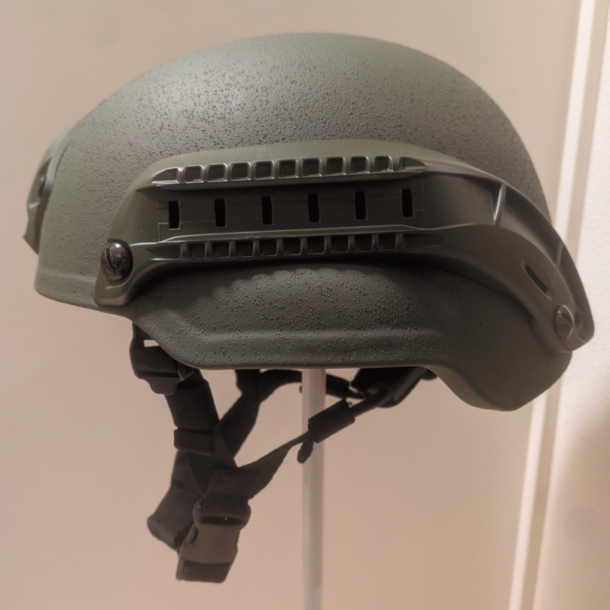 防弾ヘルメットの主要素材としてUHMW-PE(超高分子量ポリエチレン)、アラミド(ケブラー等)、複合材(UHMW- PE×アラミド等)がある。写真左の防弾ヘルメットは、UHMW-PE製である。シェルの厚さは13mm程度で、アラミドより安価で厚みがあるのが特徴である。