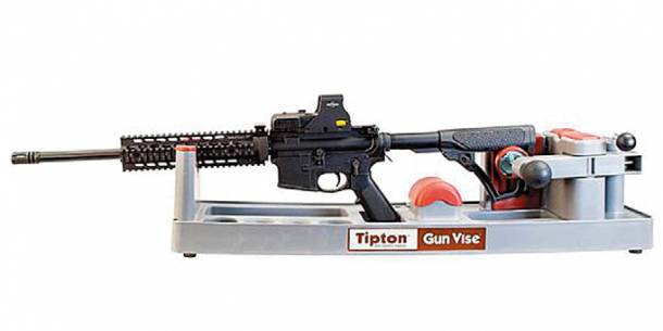 ライフルを固定する作業台。立てかけるだけでなくしっかりと挟んで固定できるのが特徴。架台は傷を防ぐラバー加工、本体は耐溶剤性に優れたポリマー樹脂製。