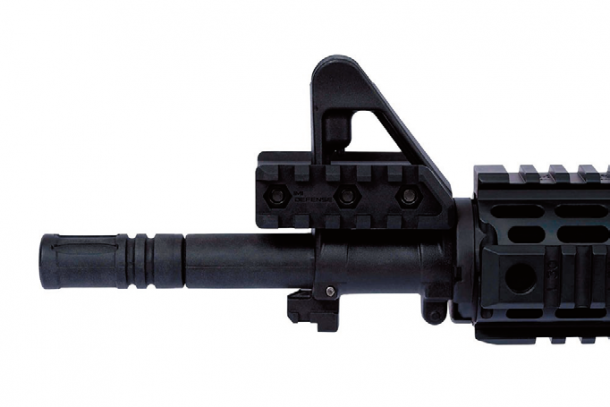 M4/M16の三角形フロントサイトに挟むように装着する強化ポリマー製レールマウント。サイト左右にピカティニーレールを追加でき、フラッシュライトやレーザーに最適だ。