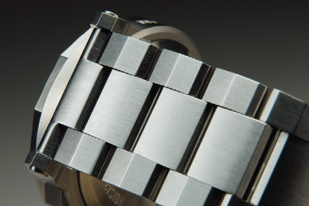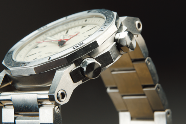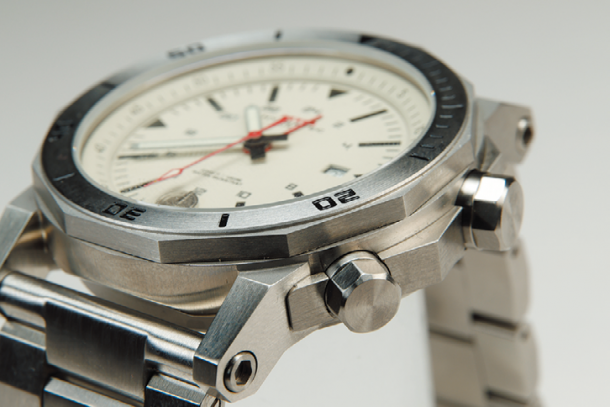 大き目なサイズ感のリューズを採用しており、時間調整が行ないやすい。ケース自体にも光沢があり、高級感のある仕上がりになっている