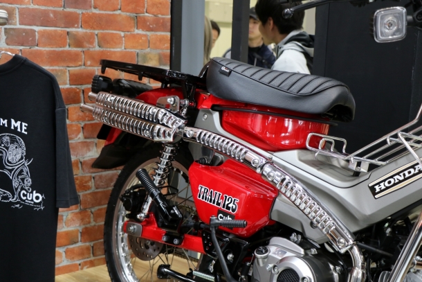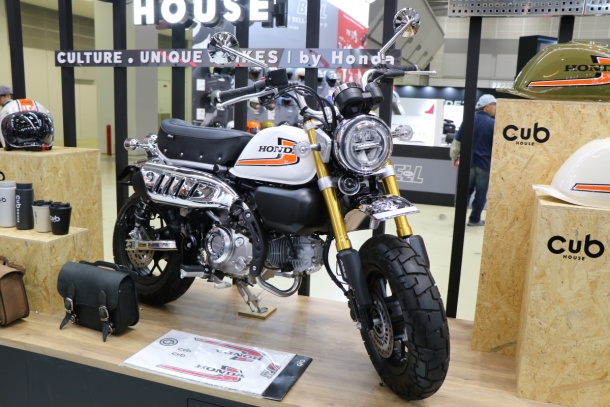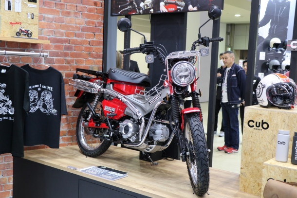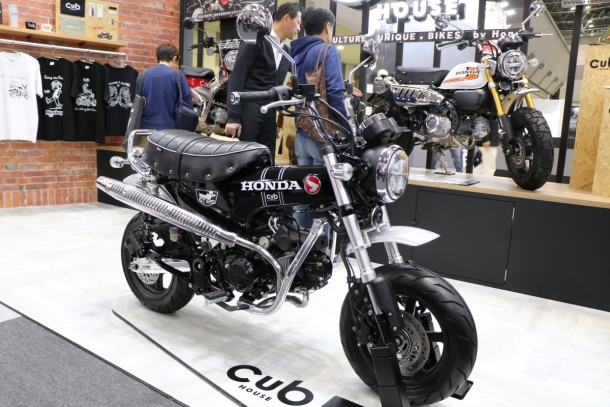 Cub HOUSEと銘打たれたブースには、Monkey125やCT125・ハンターカブ、Dax125といった人気の原付二種モデルが独自のカスタムを施され、 GクラフトやSP武川のパーツのほか、オリジナルカスタムパーツが目を引いた。