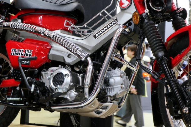CT90風なCT125・ハンターカブ。サイドカバーのデカール、センターカバーのカラーリング、細身のアップマフラー、シルバーのリアサスペンション、 アルミ製リム など、レトロな雰囲気が人気になりそうだ。