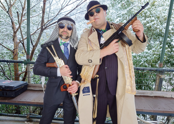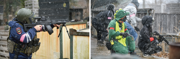 今回のイベントの主役である息根とめるさん(左)のスタイリングだが、とめラーには有名なティラノサウルスの着ぐるみに、Kryptekマンドレイクのベースボールキャップとゲーム参加時に使うAKのマガジンが収納可能なSmersh AKアサルトベストを着用している。着ぐるみの代わりにフライトスーツのようなつなぎで代用してもかっこよく収まるスタイリングである。