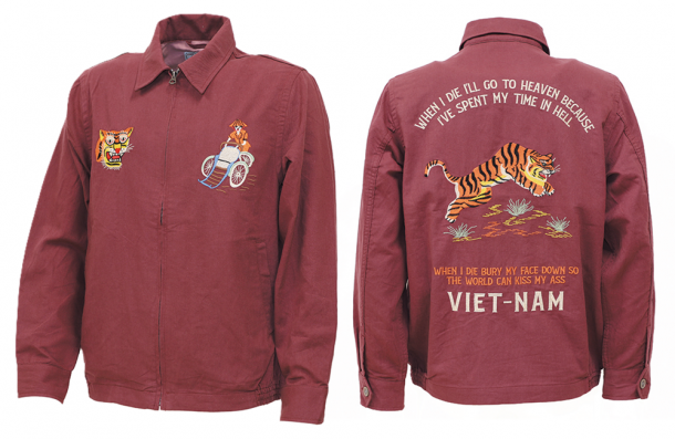 ベトナム戦争に派遣された兵士が現地で売られていたジャケットに刺繍を施し帰還時に持ち帰った「スーベニア( 記念品)」ジャケット。オリエンタルな図柄は機械刺繍で再現。