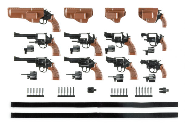 M19コンバットマグナム、M36チーフスペシャルの2機種を様々な状態で10挺再現できるセット。シリンダーは選択式、ハンマーは起倒それぞれあり、スイングアウト状態、コック状態も再現できる。クラシカルなホルスターも付属。