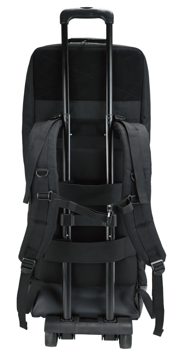 ハンドルは上下と側面(左側)の3ヶ所に配置されており、背負うほどでもない運搬や移動の際に役立つ。さらに、背面のキャリーベルトで市販のキャリーカートに固定可能だ。背負い面に着脱が簡単にできる面ファスナー固定式キャリーカート取り付け用ベルトと底面にバックル対応のキャリーカート用ベルトが装備しており、一般的サイズのハンドル幅22cmのキャリーカートが対応する。使用の際はキャリーカートに「Type83エアソフトバッグ」を乗せて、底面キャリーカート固定ベルトのバックルを緩みなく止め、背面の面ファスナーベルトでキャリーカートに固定する。これで簡単にキャリーバックにすることができる。