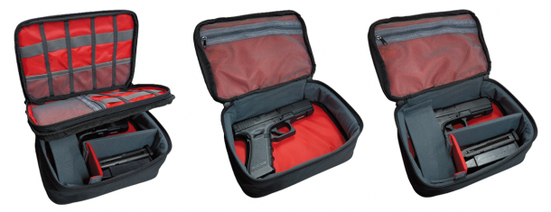 開口しやすいダブルファスナーと付属の取り外し可能な中仕切り3枚で自由自在にレイアウトできるクッションケース。内部にはネットポケットもあるので、ハンドガン2挺やマガジン、工具等の小物がスッキリ収納できる。