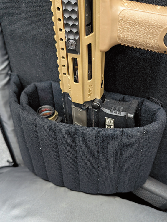 内側のエアガン収納スペースは、面ファスナー対応になっており、エアガンを固定するための面ファスナーが4本付属する。それを使って自由に固定できるだけでなく、面ファスナー対応のポーチなどの装着も可能だ。周りを囲むように縁まで厚手のクッション材で覆い、バッグの中心と背面、底面、2気室のサイドに芯材を装備することで、収納したエアガンの変形を防いでいる。