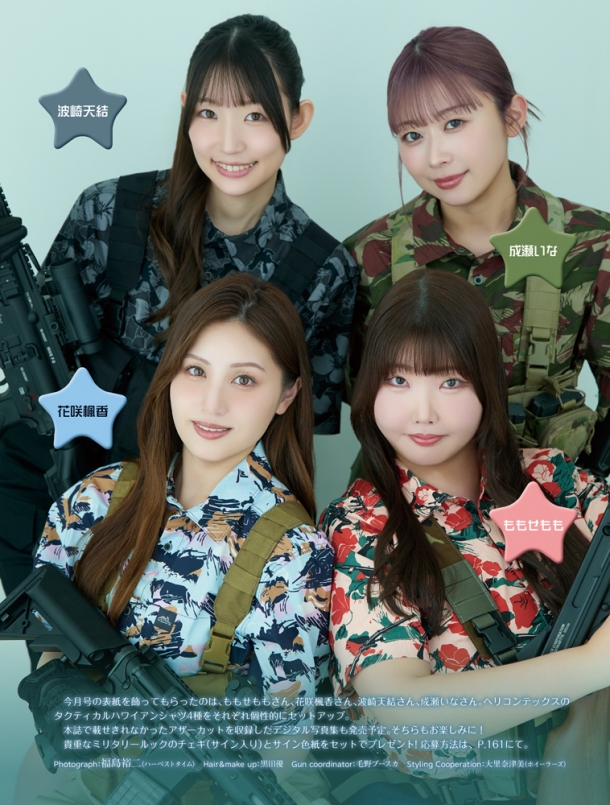 今月号の表紙を飾ってもらったのは、ももせももさん、花咲楓香さん、波崎天結さん、成瀬いなさん。ヘリコンテックスのタクティカルハワイアンシャツ4種をそれぞれ個性的にセットアップ。本誌で載せきれなかったアザーカットを収録したデジタル写真集も発売予定。そちらもお楽しみに!
